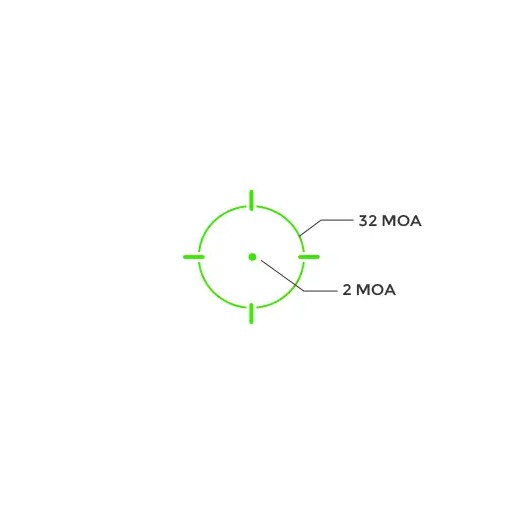 OVERALL LENGTH: 1.6″, MAGNIFICATION: 1X, RETICLE: 2 MOA Red Dot + 32 MOA Circle I WEIGHT: 1. oz with Battery